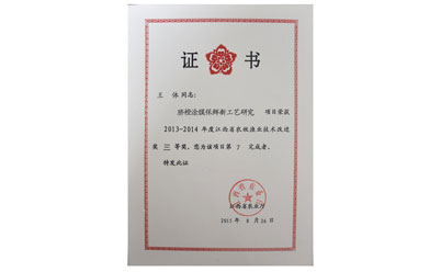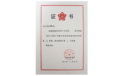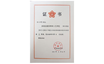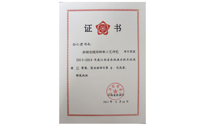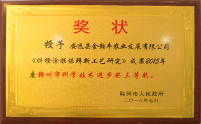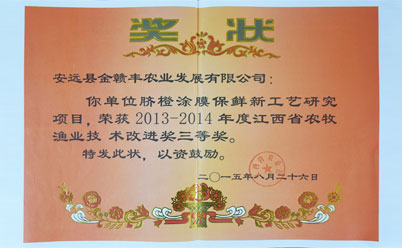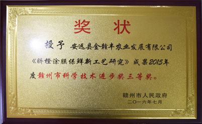 获得《赣州市科学技术奖励》授予“脐橙涂膜保鲜新工艺研究”三等奖;